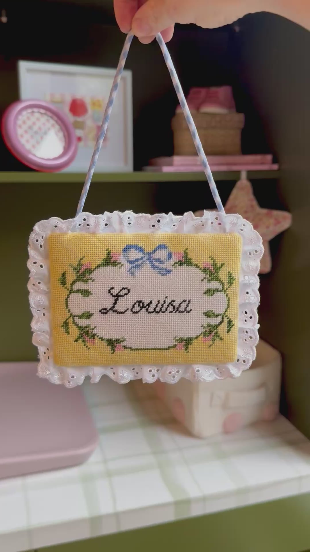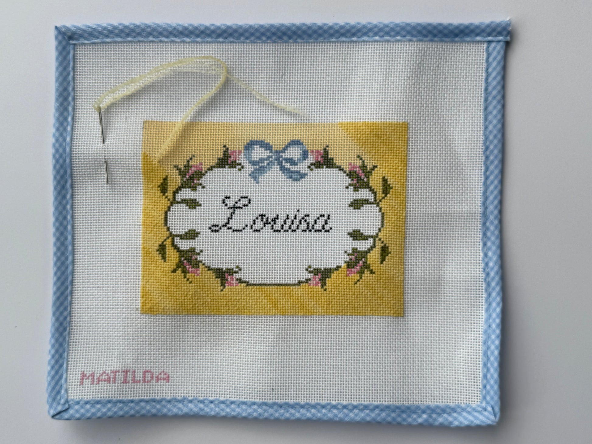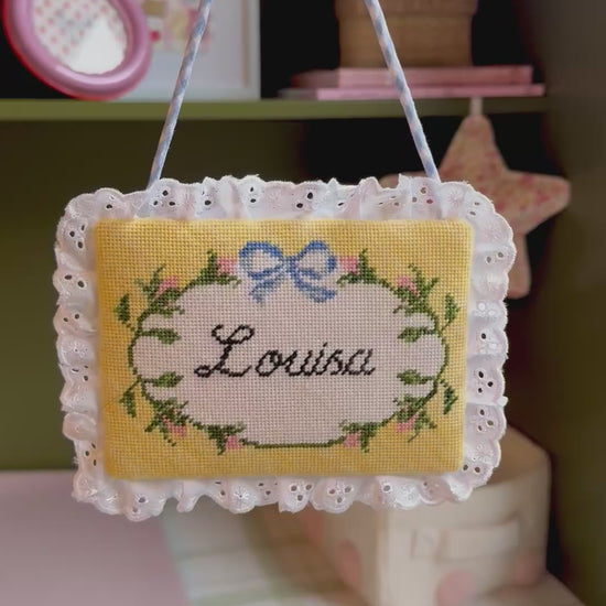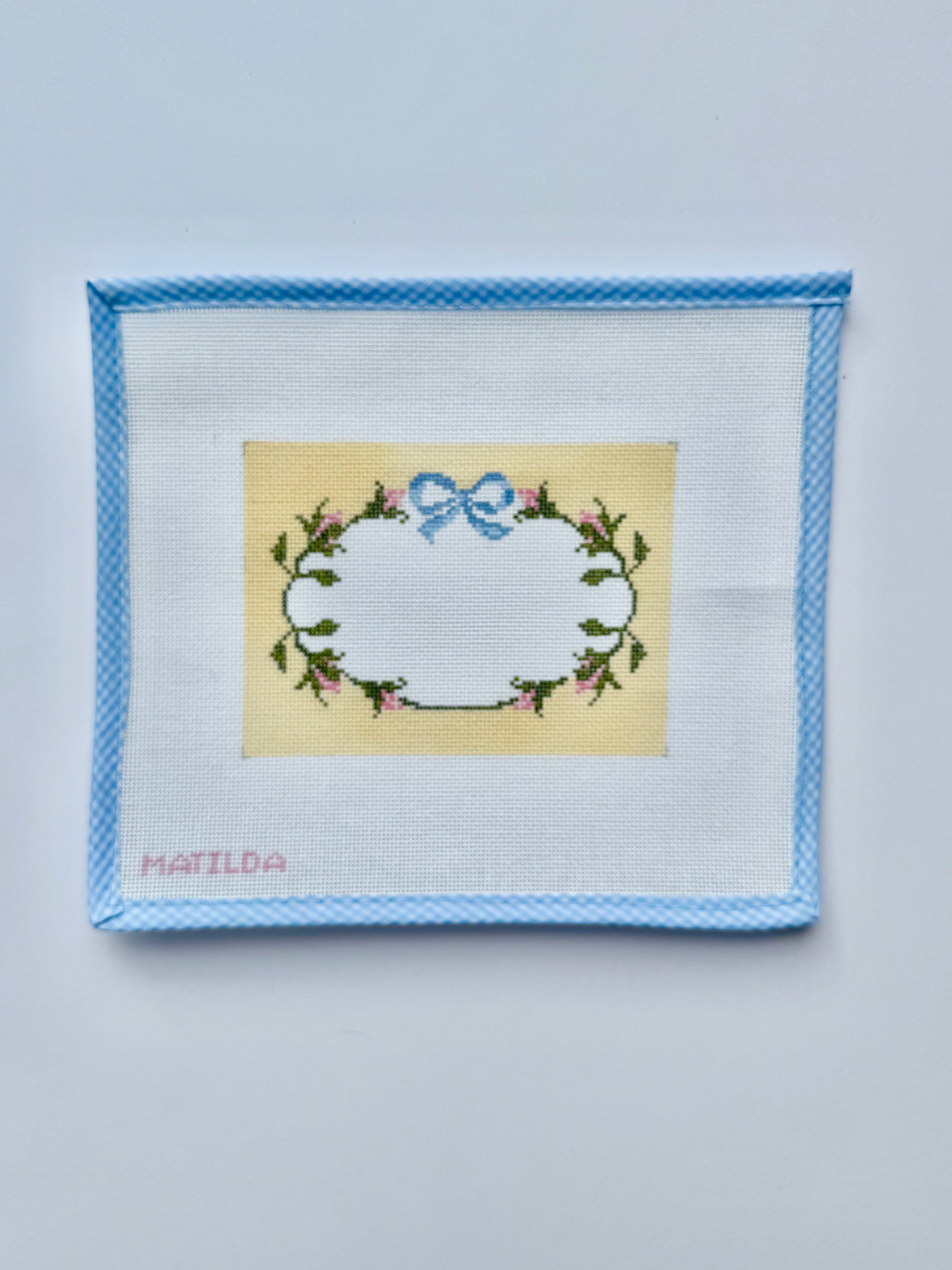 This charming needlepoint canvas features a delicate floral frame of pink rosebuds and green vines, crowned with a pastel blue bow. A soft lemon yellow background adds warmth, while the blank centre invites a custom name or initial to finish it off.