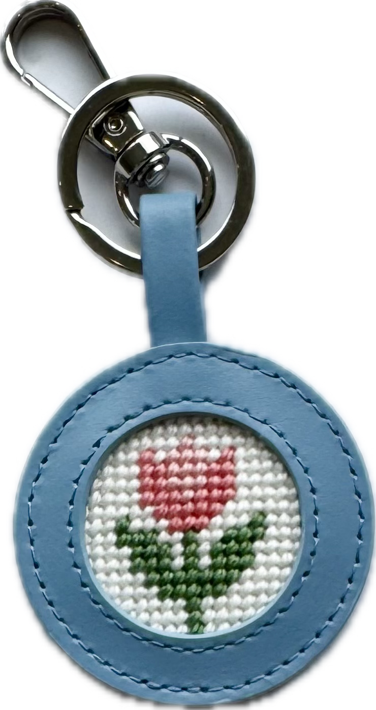 - a self-finishing needlepoint keyring in your choice of colour (pink or blue)